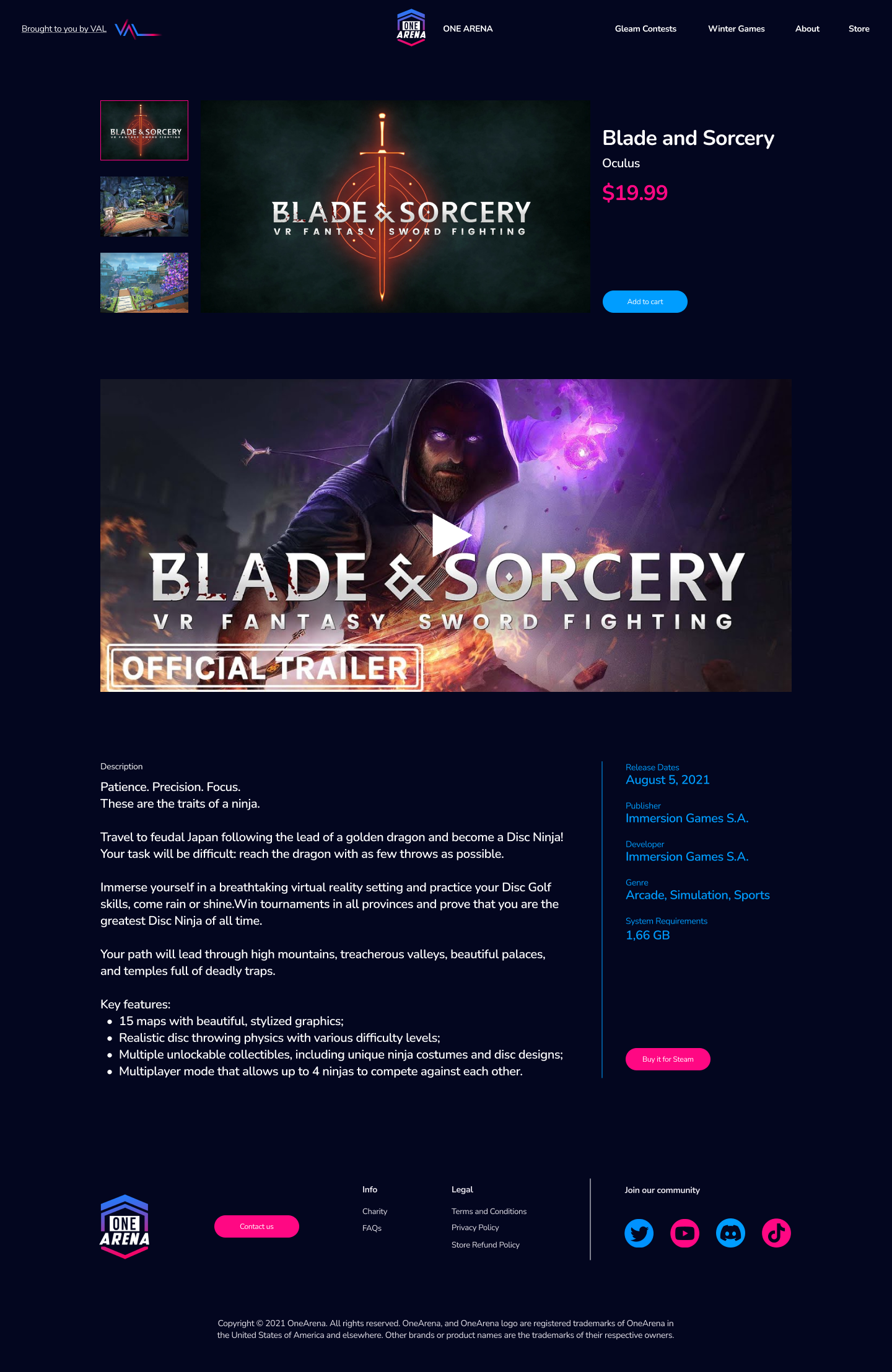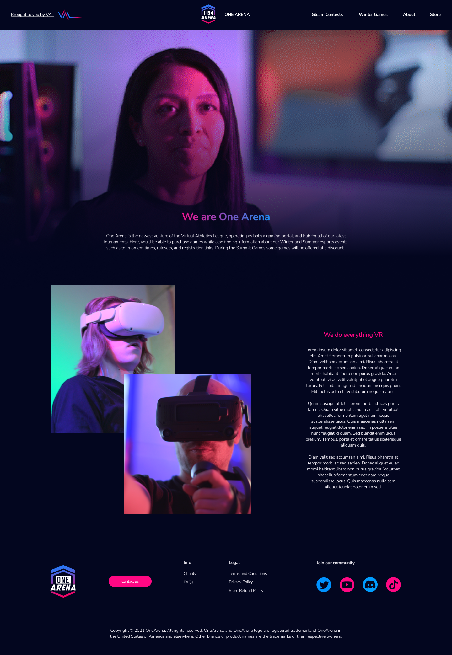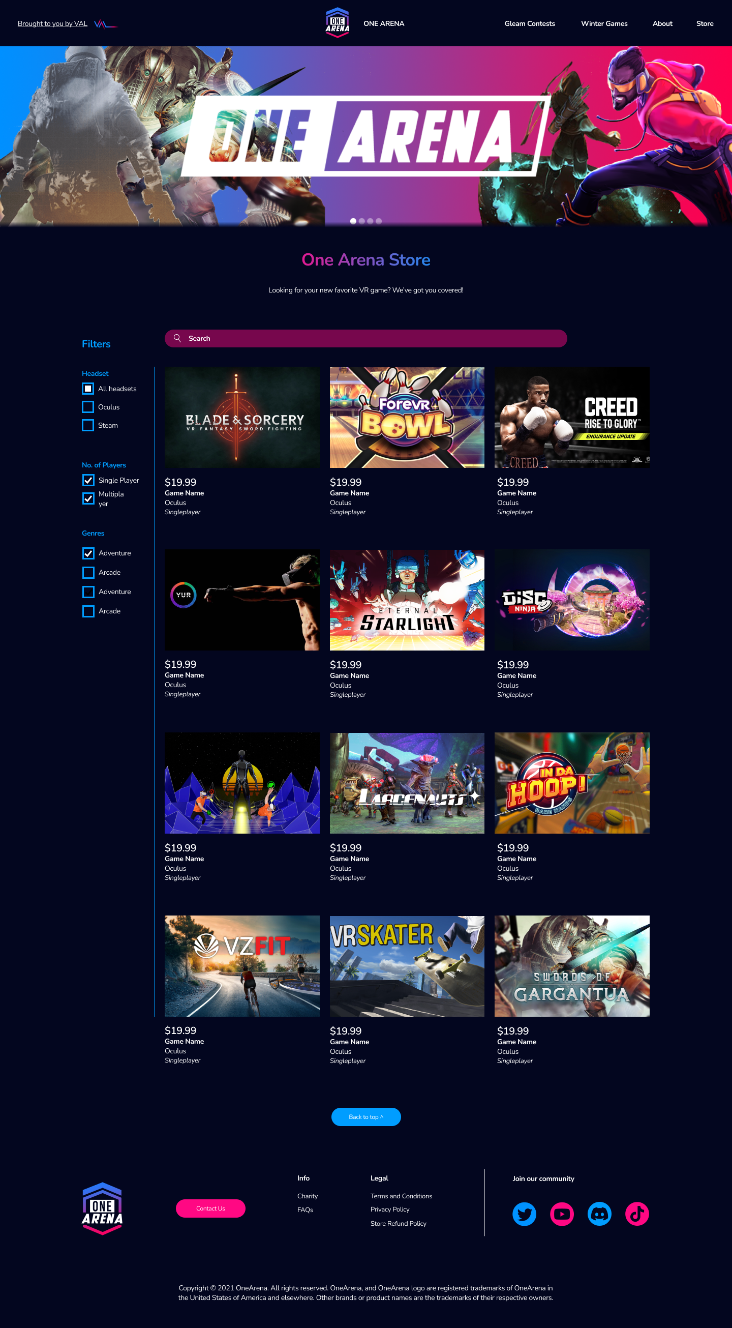 Brief Redesign One Arena website for VAL to sell game titles, host virtual reality tournaments and influencer giveaways.