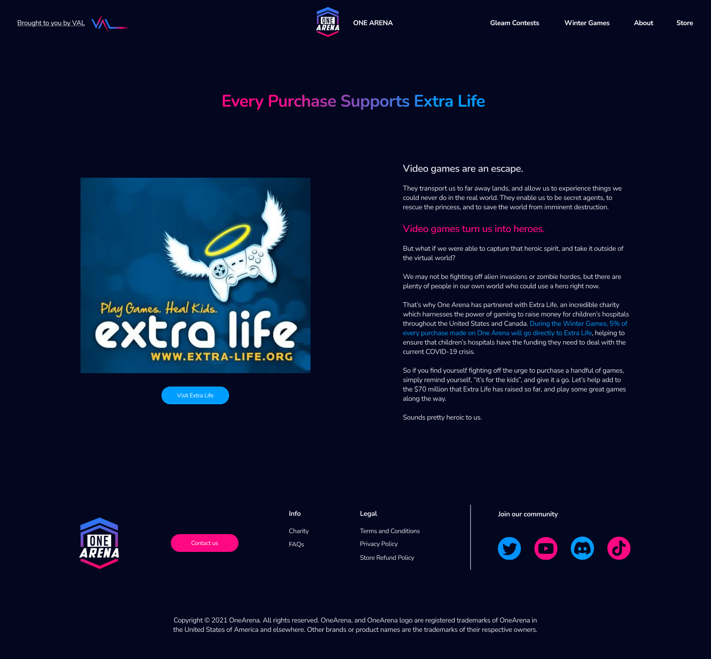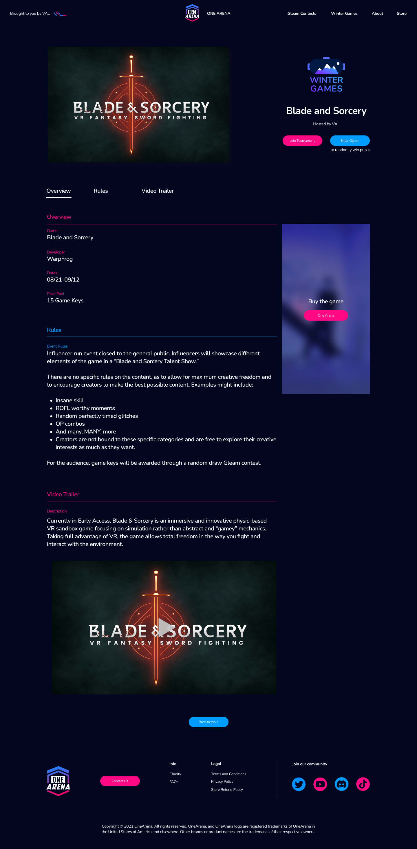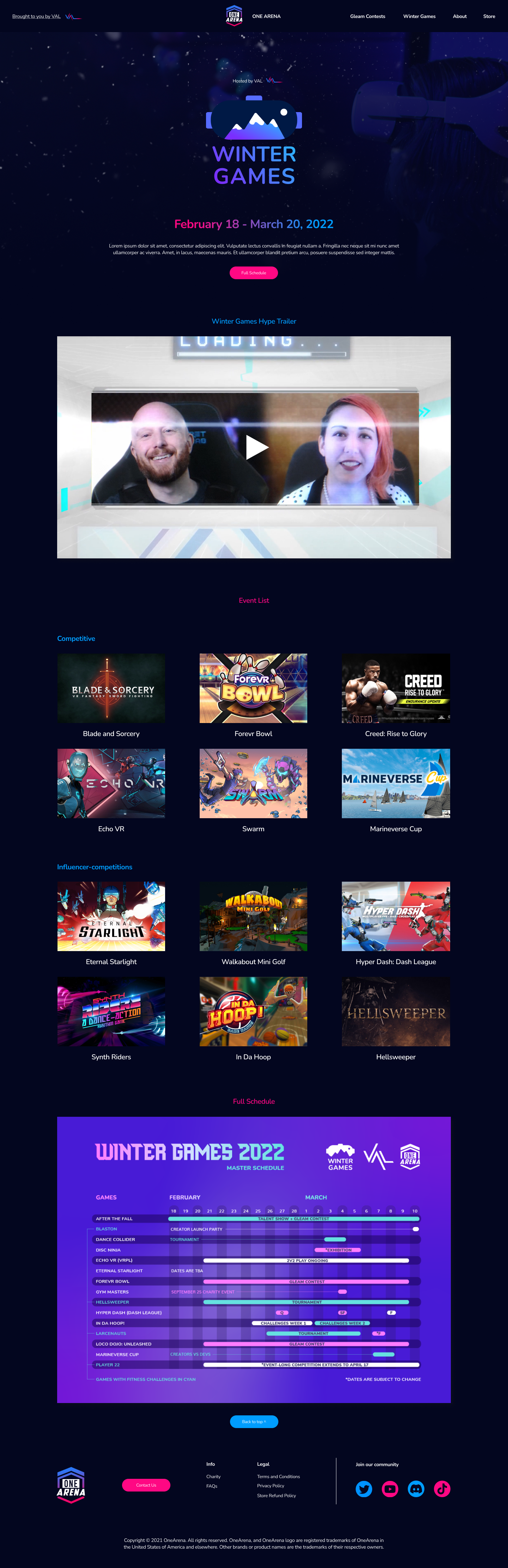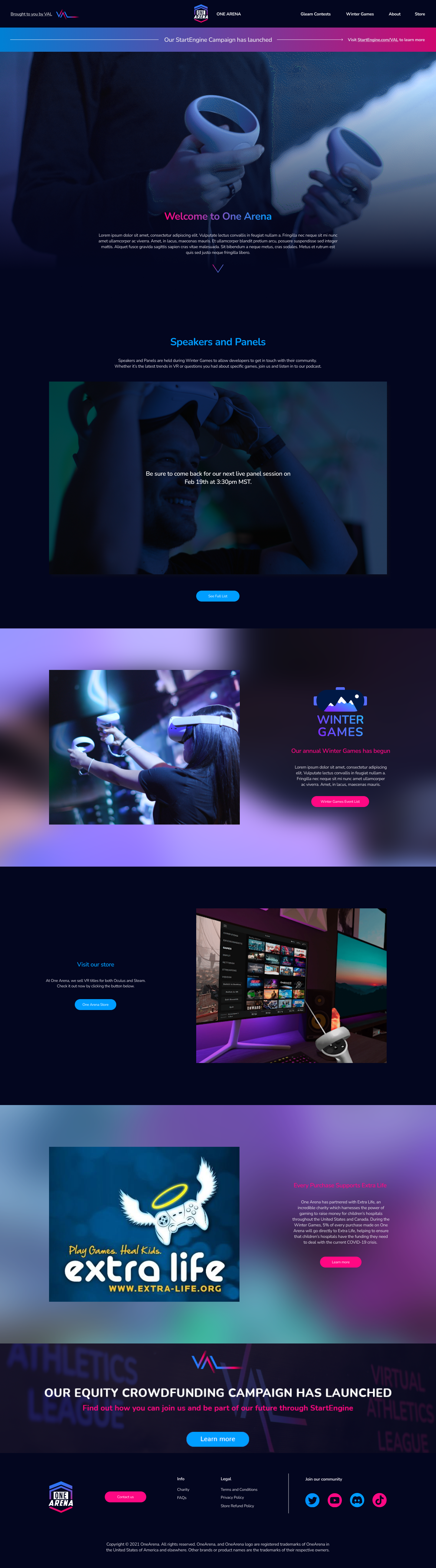 Brief Redesign One Arena website for VAL to sell game titles, host virtual reality tournaments and influencer giveaways.