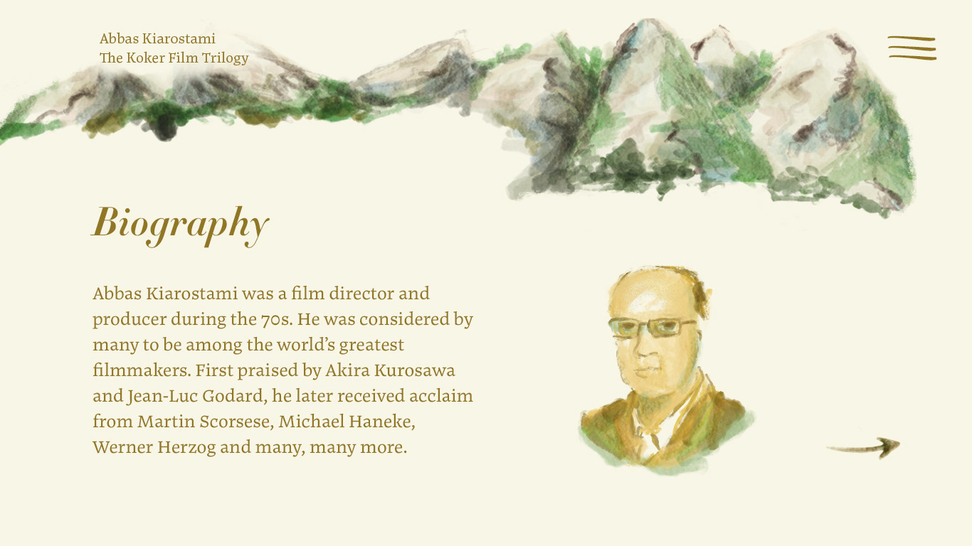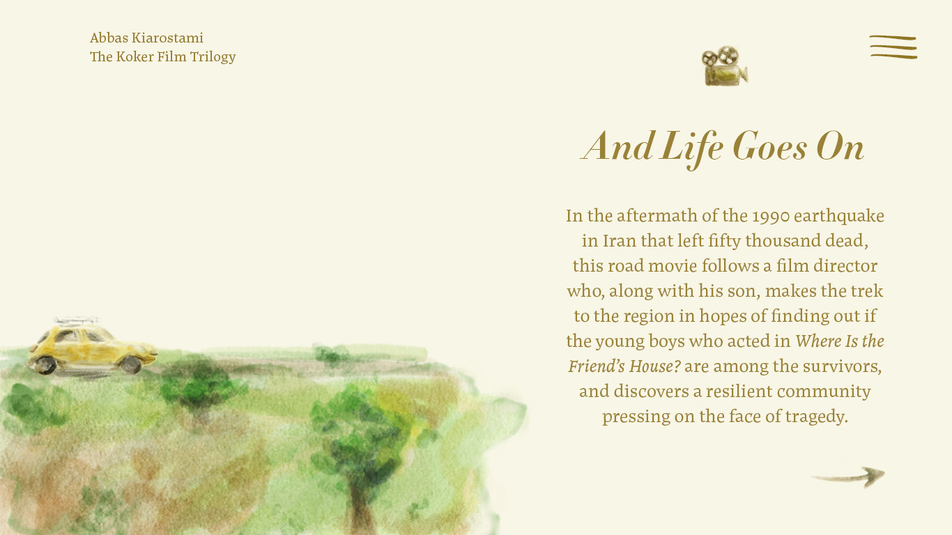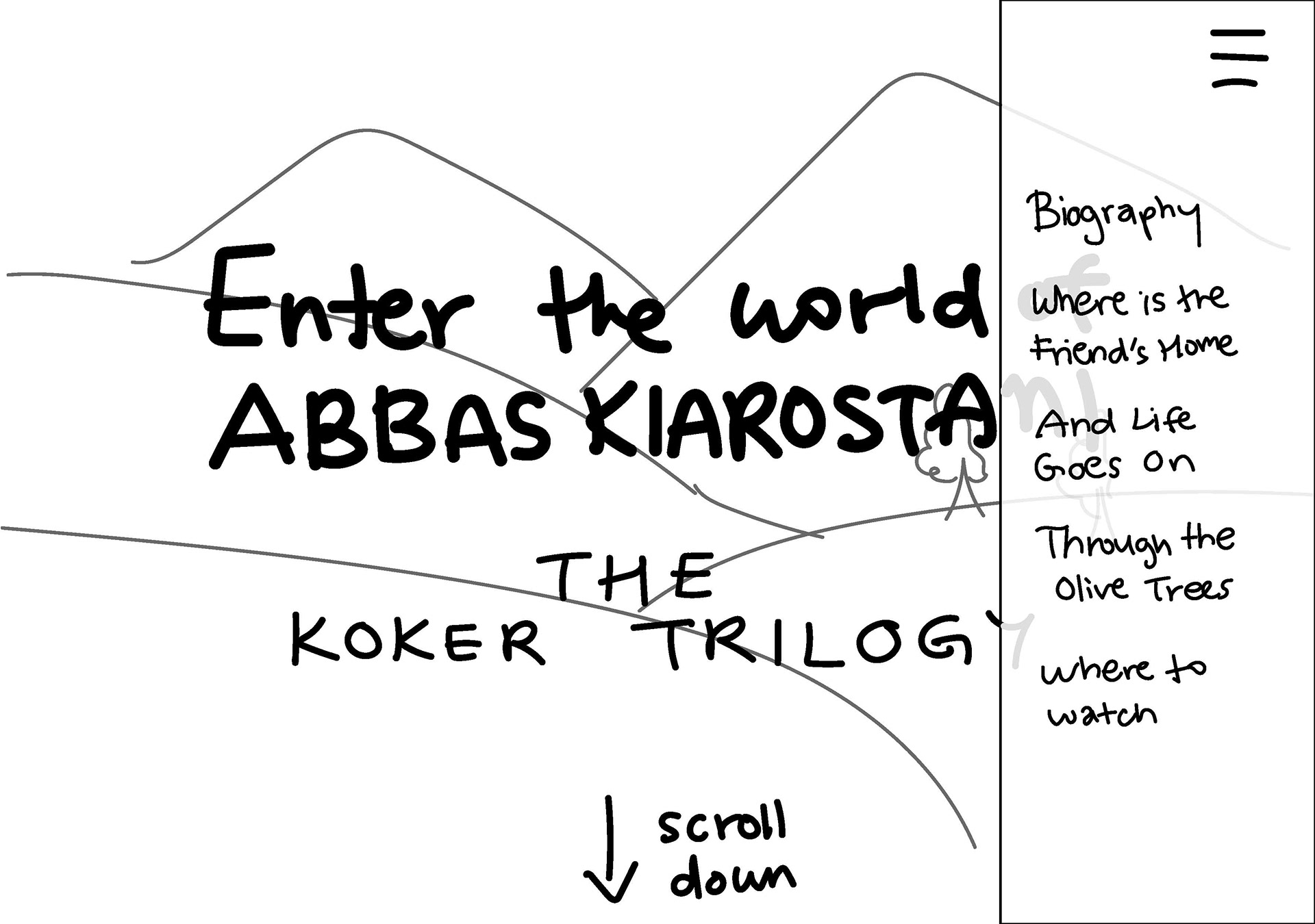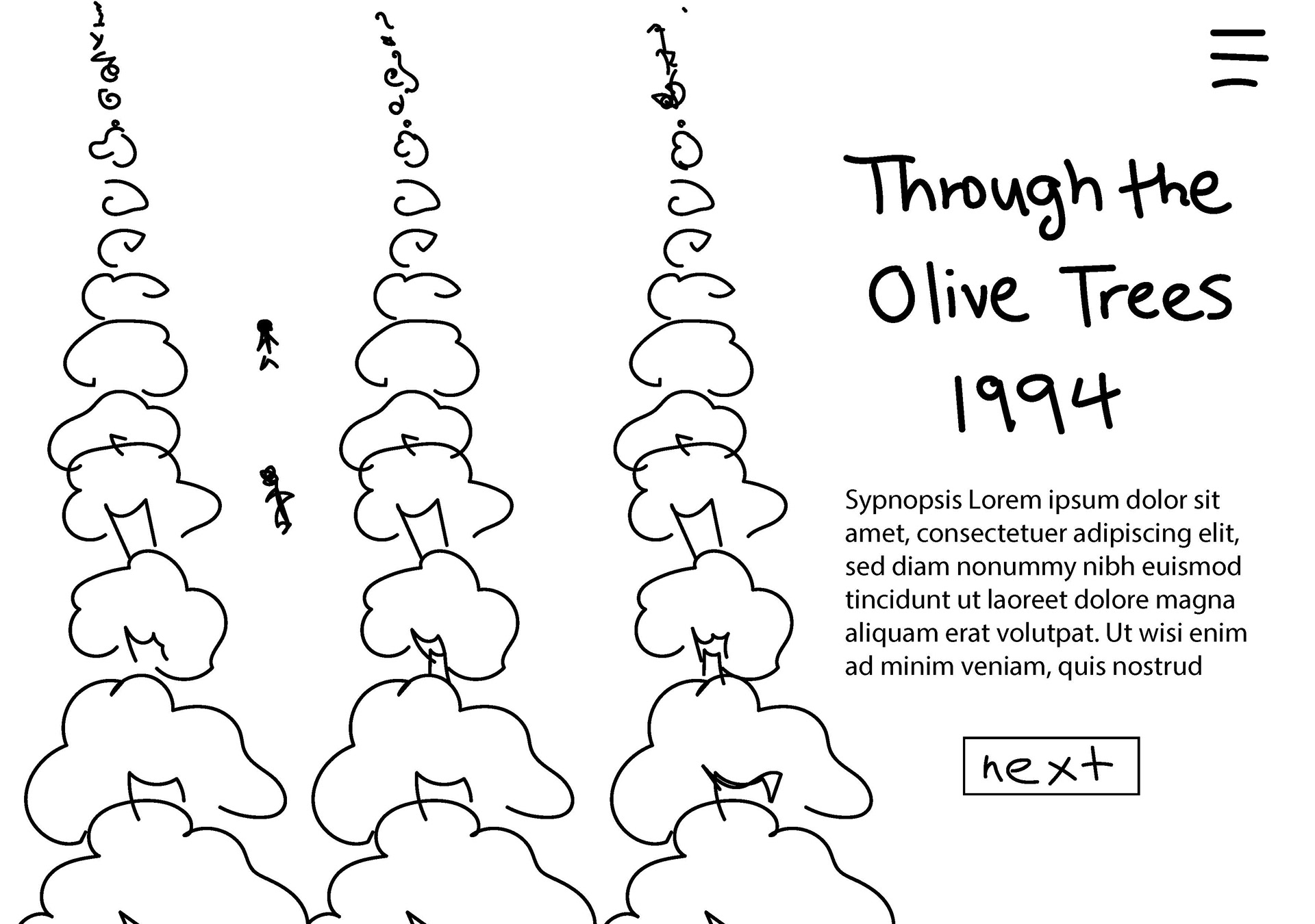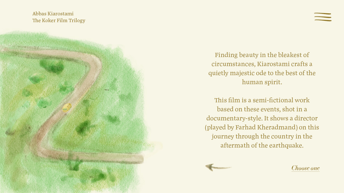 From information gathering, wireframing, to developing, I built a website to promote Abbas Kiarostami's Koker Film Trilogy using a distinct art style that highlights the storytelling and poetic nature of his three films.