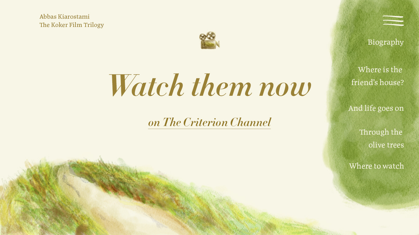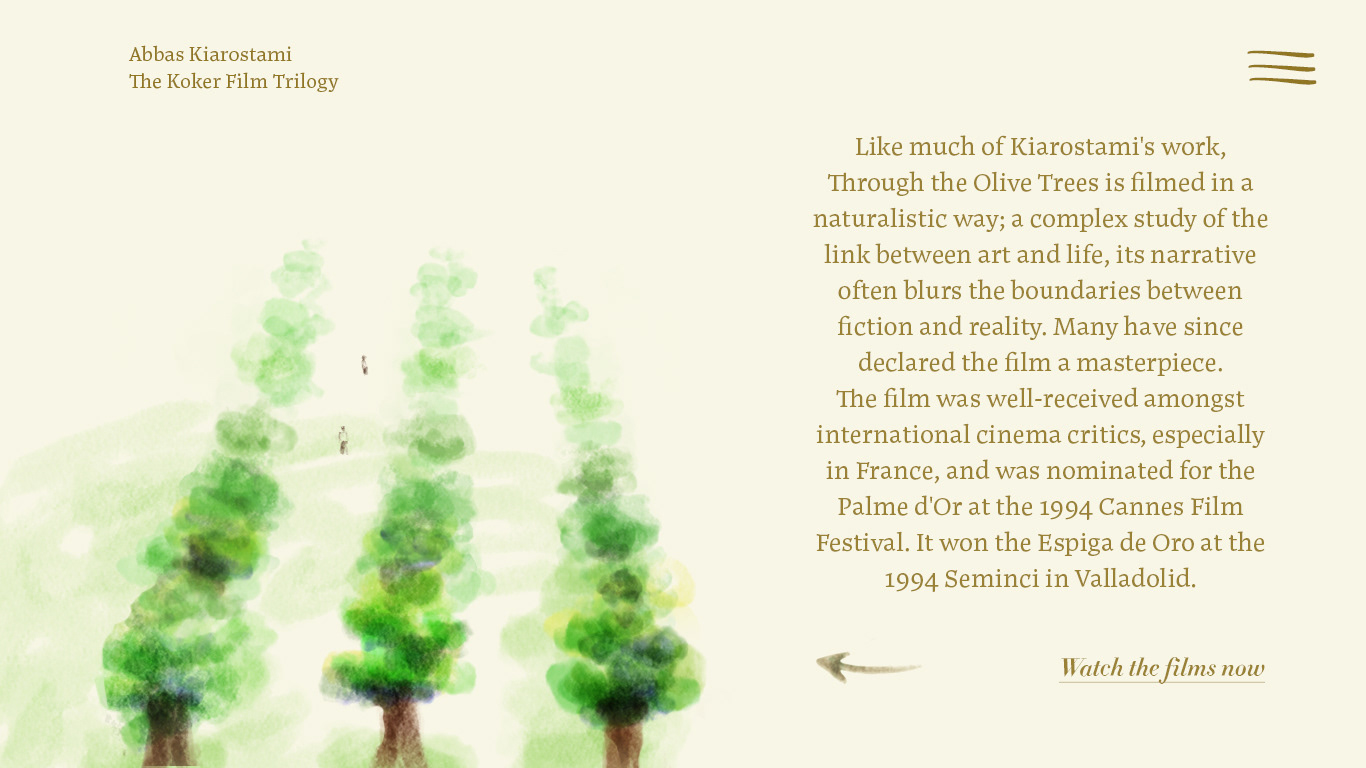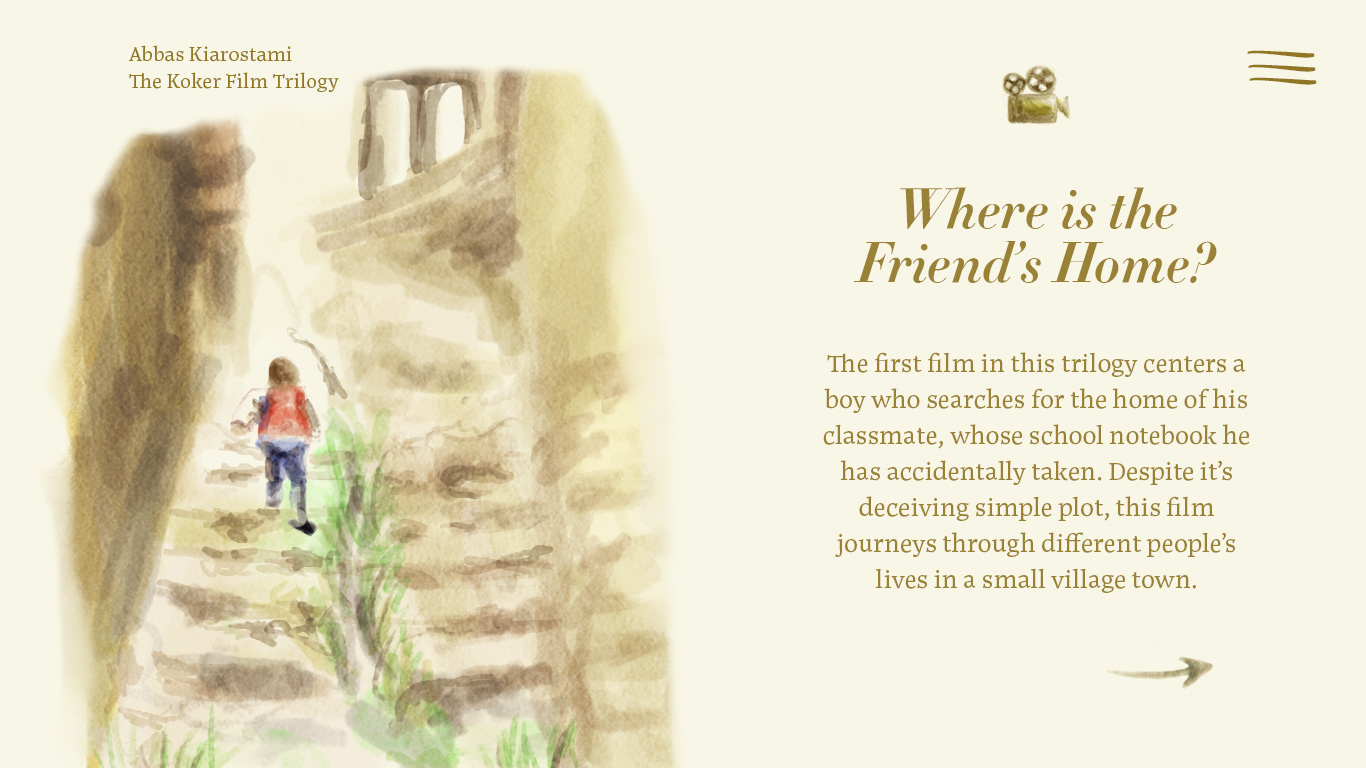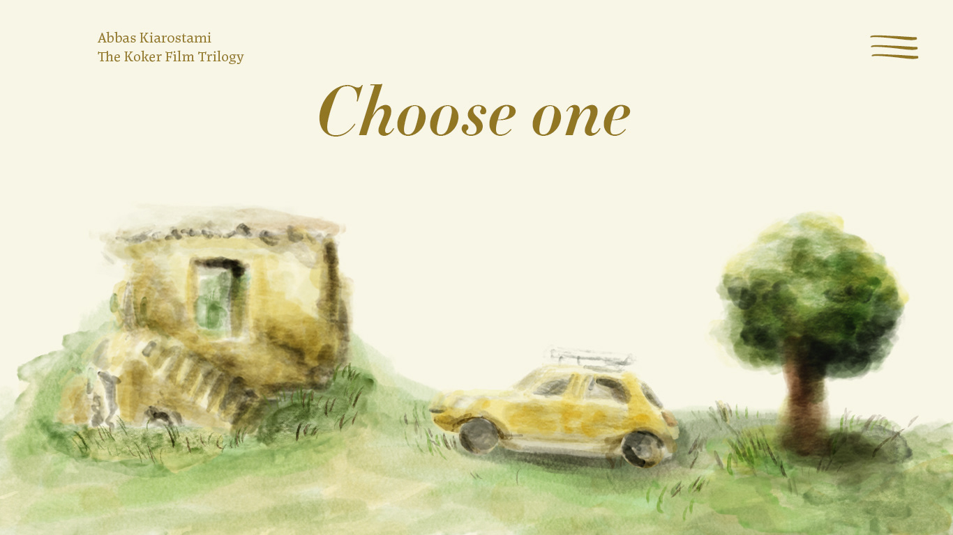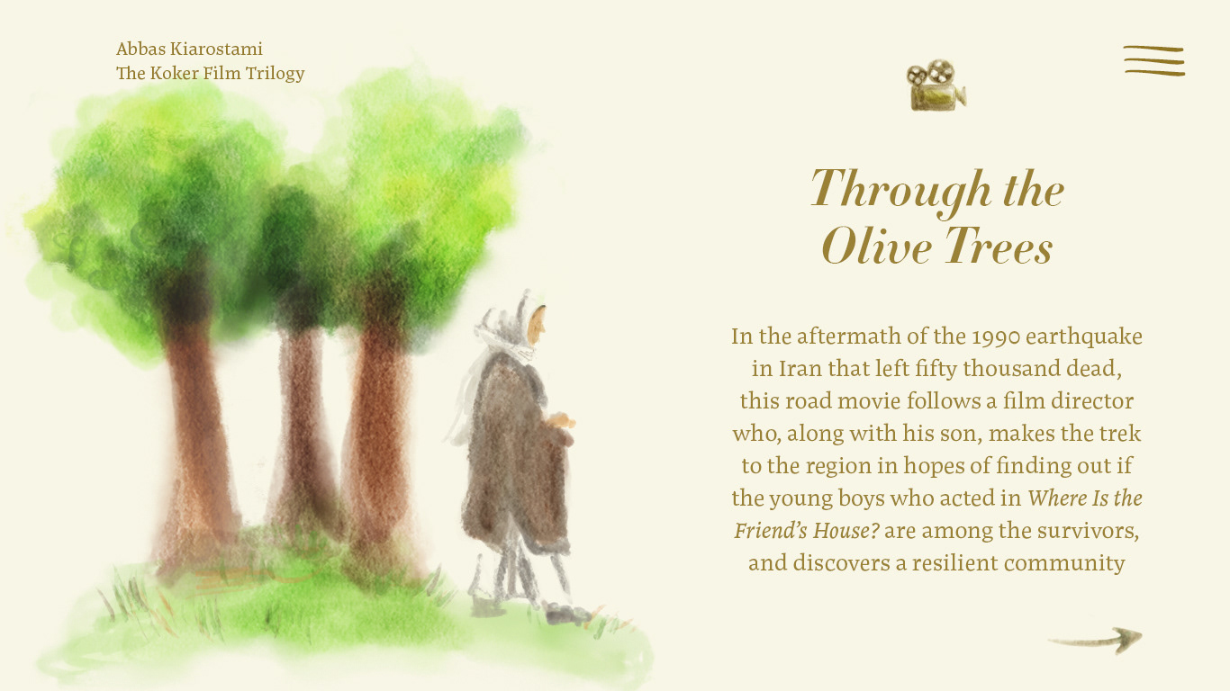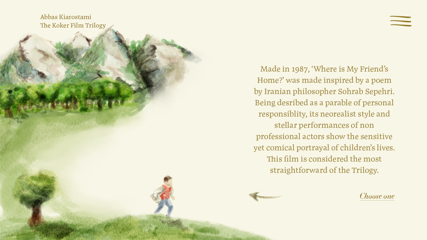 From information gathering, wireframing, to developing, I built a website to promote Abbas Kiarostami's Koker Film Trilogy using a distinct art style that highlights the storytelling and poetic nature of his three films.